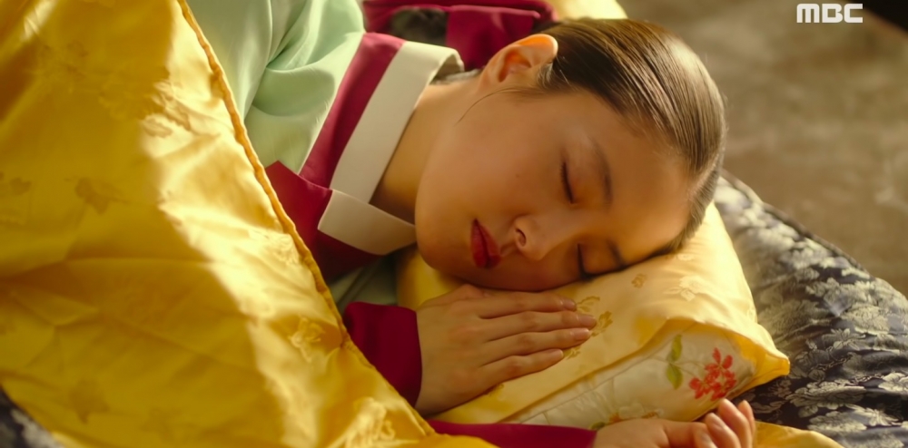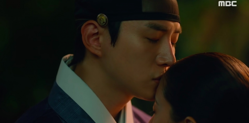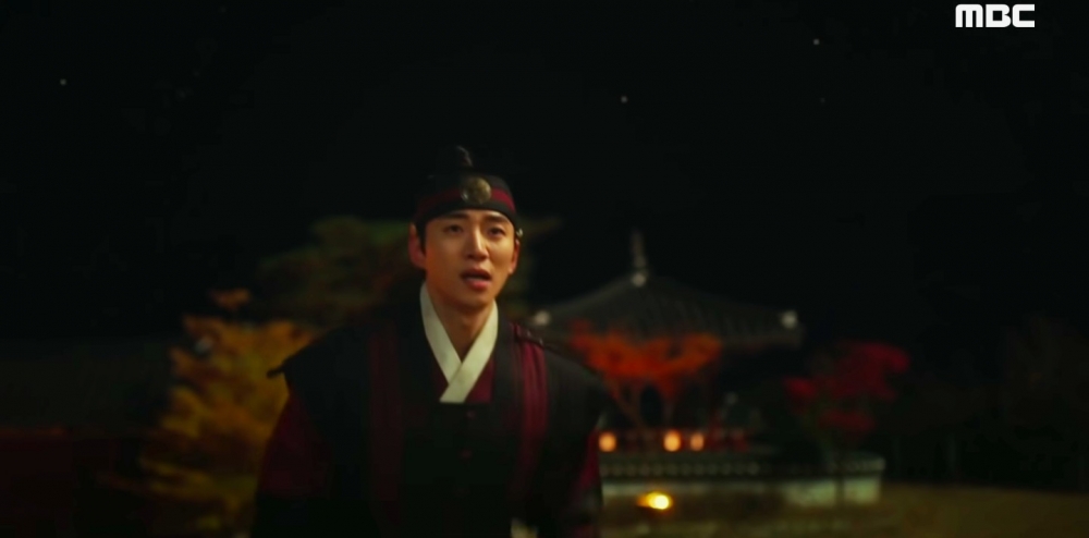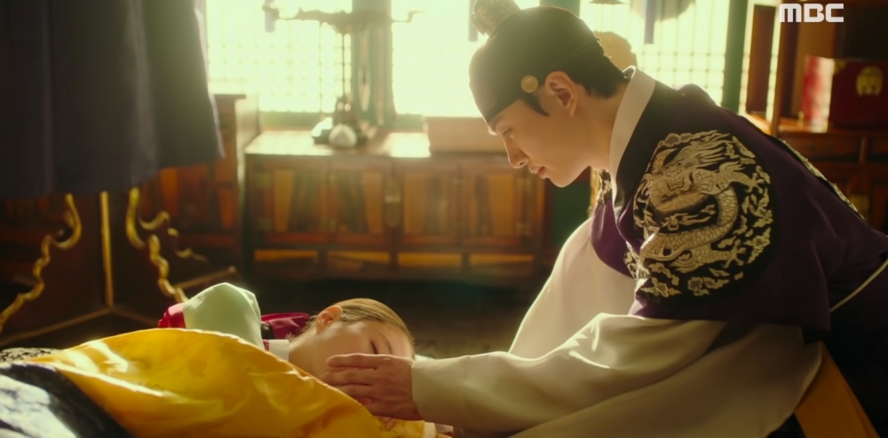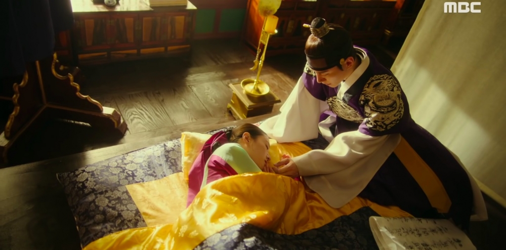 因為皇帝精神狀態不佳,便讓李祘代替自己出宮巡視先王們的陵墓。然而因為設備老舊的別宮暖爐故障,徐尚宮便讓德任去躺李祘的床、幫忙暖被,沒想到德任卻不小心睡著了XD 回到房間的李祘發現德任後並沒有叫醒她,而是情不自禁地伸手想撫摸她的臉,卻又不敢真的碰觸到她。李祘只是輕聲喃喃:「妳膽子真大啊,都不怕我對妳做什麼嗎...」