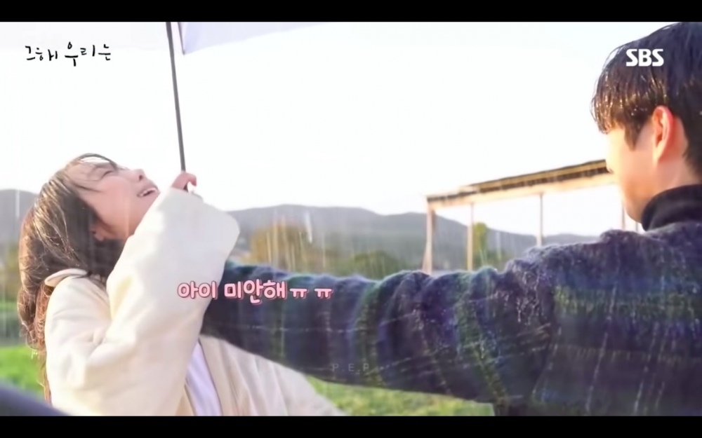 金多美講台詞忍不住笑場,原來是因為崔宇植的模樣實在太慘太好笑!因為劇中崔雄把傘整個撐給延秀,結果毫無遮蔽的崔宇植瘋狂被雨水洗臉,眼睛都睜不開了(笑倒)。好險最後還是完成拍攝啦~比起劇中注重唯美氛圍,花絮感覺吻的更深,還轉頭換角度啥的...(羞)