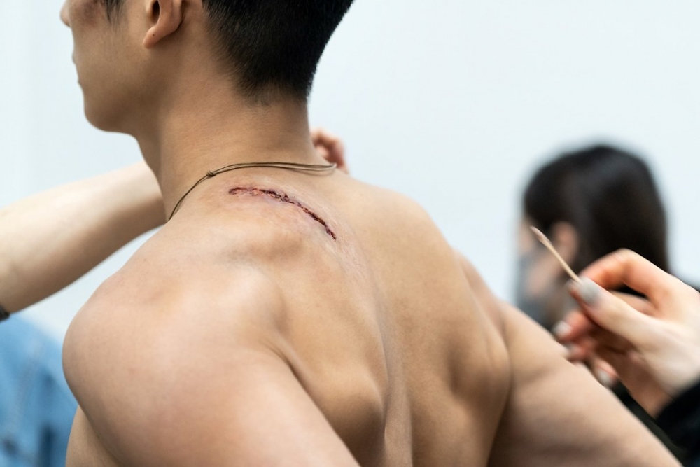近日,丁海寅經紀公司釋出《雪降花》花絮照,公開了化妝師在給丁海寅化特效妝時的幕後照片。因為要在身上化傷妝,所以丁海寅全程光著上半身,精壯的胸肌、臂肌和背肌全都一覽無遺!說是男神迄今為止身材最好的角色,所言不假啊~