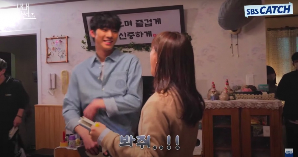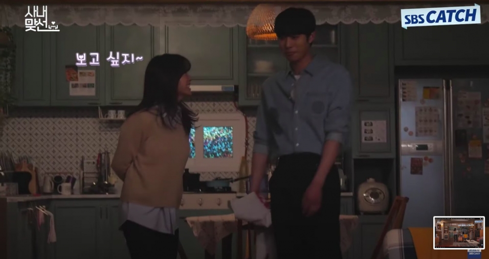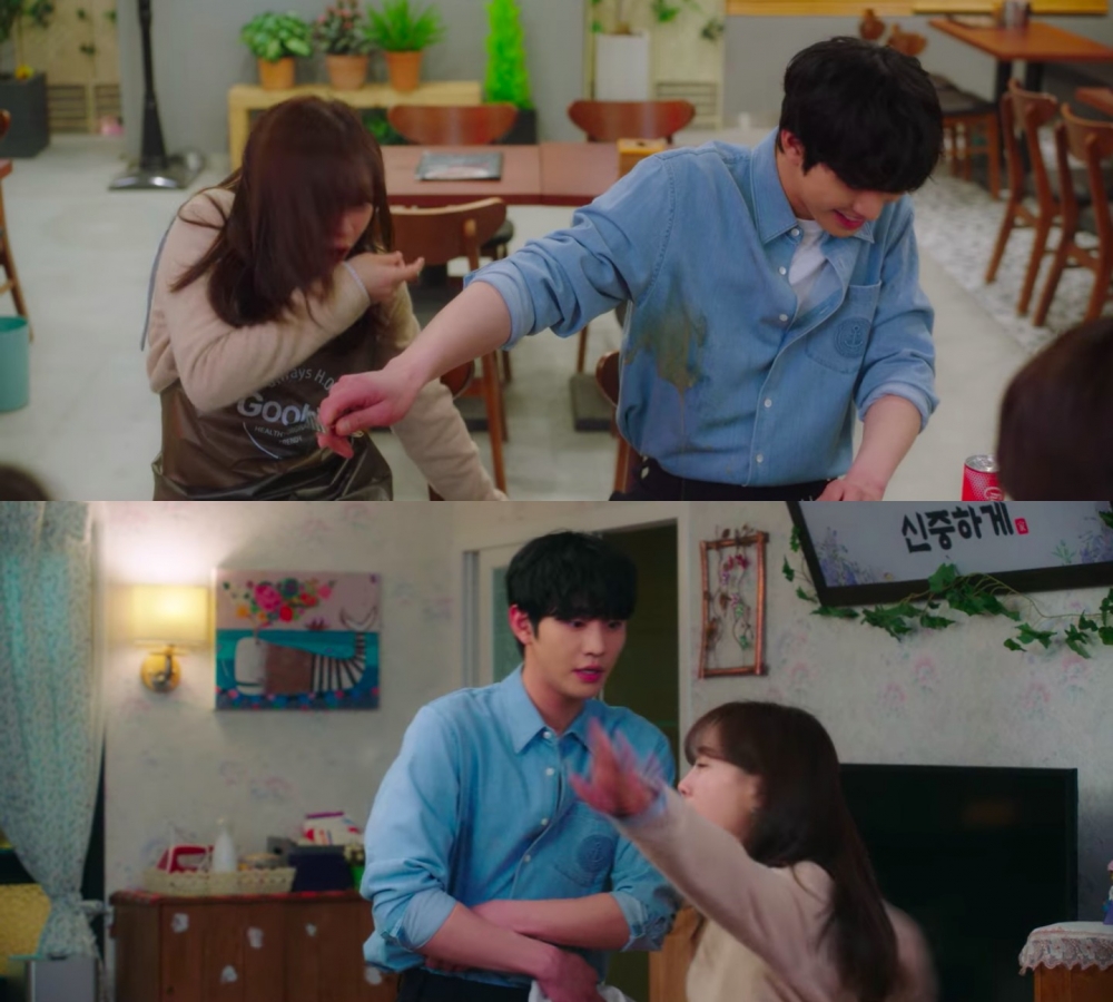 在最新播出的第14集中,有一幕是姜泰武(安孝燮 飾)、申夏莉(金世正 飾)、車成勳(金旻奎 飾)、陳妍書(薛仁雅 飾)一起在夏莉家的炸雞店用餐,泰武的衣服被可樂潑到,夏莉便帶他去換衣服,結果反被泰武調戲:「是想看我脫衣服嗎?」XD