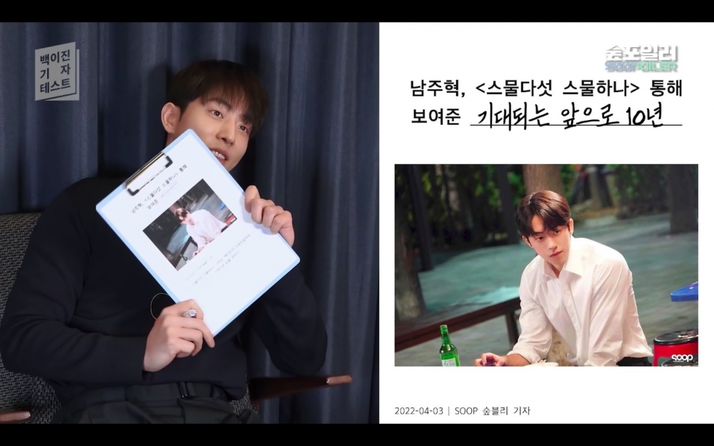 在最新公開的影片中,經紀公司讓南柱赫自己填空新聞標題(約4:40處)「南柱赫,通過《二十五二十一》展現___ 」,南柱赫寫下了「令人期待的未來10年」,他表示:「我個人的期望是,不愧對努力,以值得期待的演員被大家記住。」小編覺得我們男朋友這次通過《二十五二十一》真的做到啦~