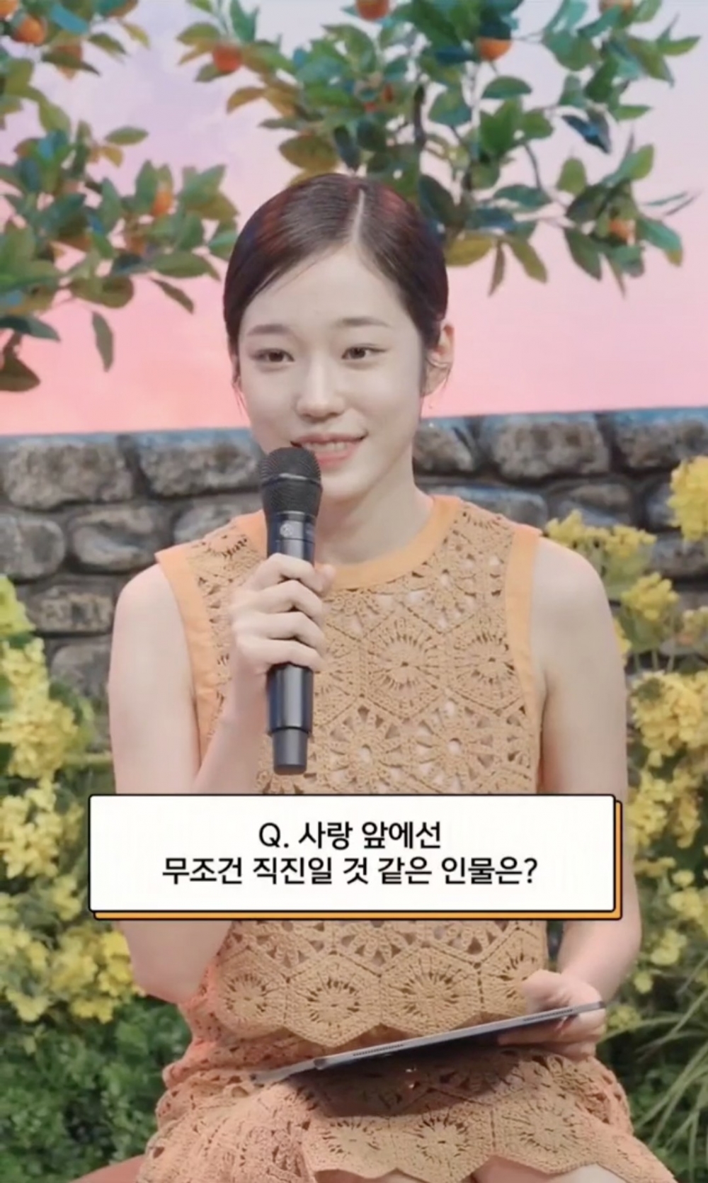 如果《我們的藍調》中的角色存在於現實生活中,面對愛情無條件勇往直前的人會是哪個角色呢?盧允瑞選擇對宣亞很直接表達情感的東昔作為第一名。裴賢聖則選擇單戀著英玉的定俊(金宇彬 飾)為第二名,盧允瑞在一旁笑到不行的說:「你是(金宇彬的)向日葵嗎~」,裴賢聖還很不好意思的問覺得如何,盧允瑞馬上表示:「同意,當然同意!」。