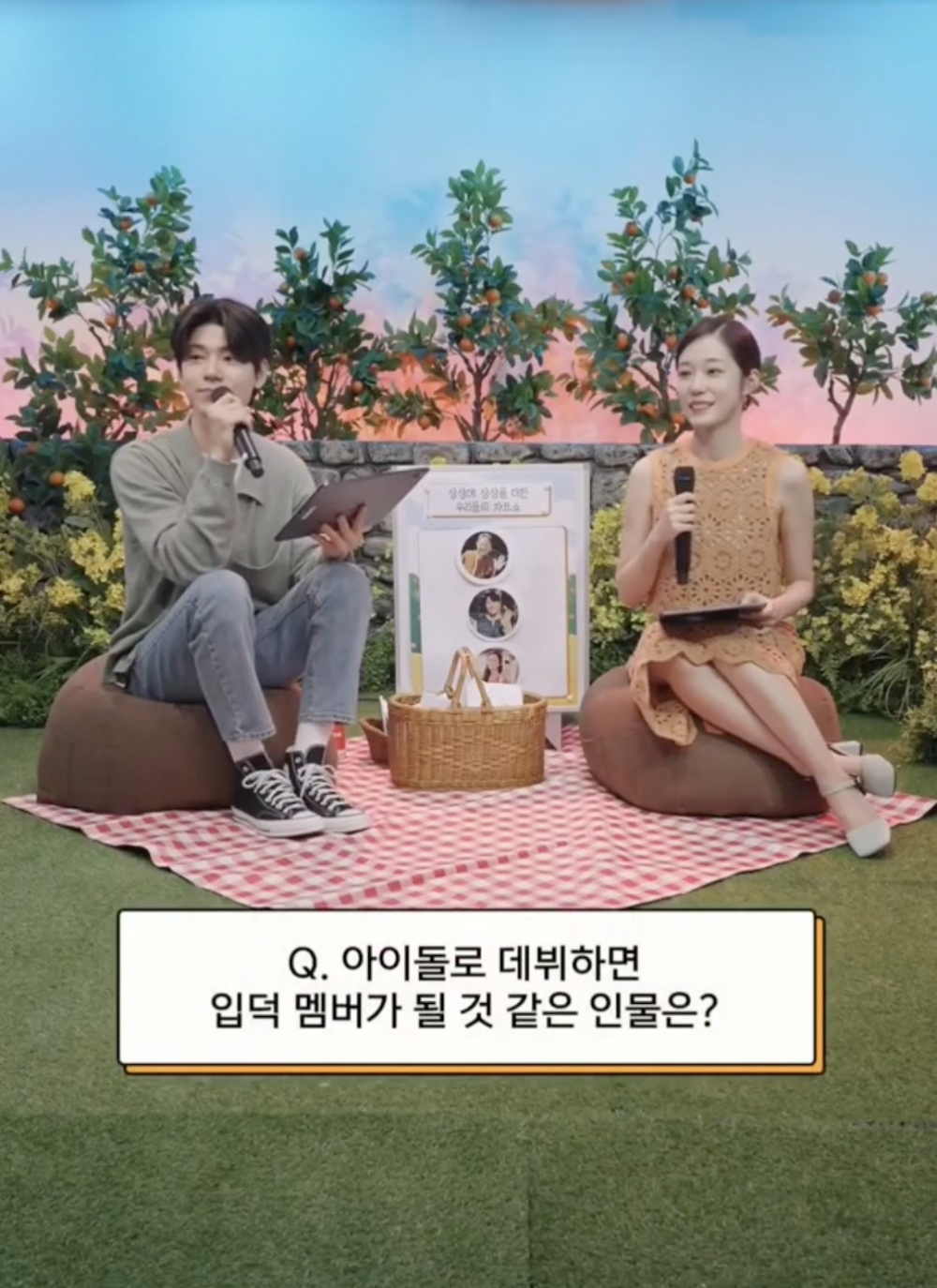被問到如果劇中角色作為偶像出道的話會入坑誰?兩位直接幫《我們的藍調》角色組成一個六人Idol團體,主唱是「恩喜」,主舞的話兩位分別選了會掀翻KTV的「東昔」和「漢修」,選到門面擔當時裴賢聖毫不猶豫地貼上「英珠」的牌子,最後分別選了最有領導力「玉東」和海女們的隊長「春禧」作為隊長。