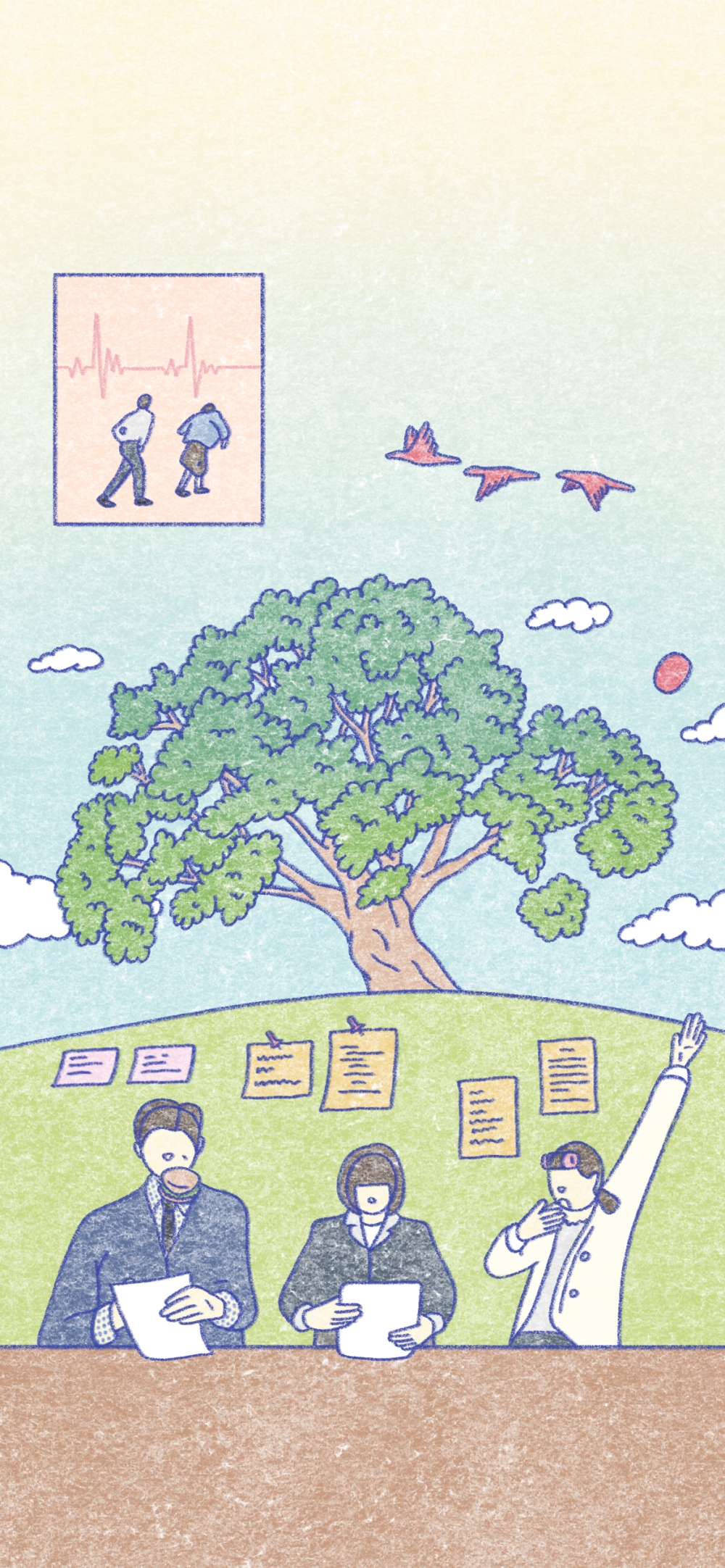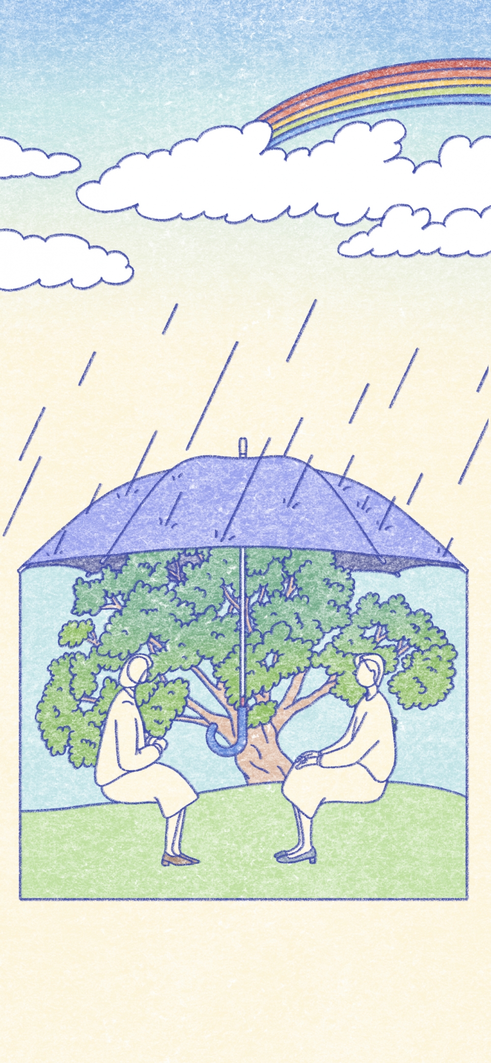第7集插畫是為了昭德洞案件努力工作的汪洋Team,另外左邊還畫了一起爬上朴樹山坡的濬浩和英禑,兩人身後的心電圖也呼應了英禑的心跳測試。而第8集中插畫中,是汪洋紅傘與藍傘泰山的神經戰。英禑與太守美相對而坐,雖然下著雨,但就像雨後會出現彩虹一樣,恩禑複雜的感情也迎來了釋懷。