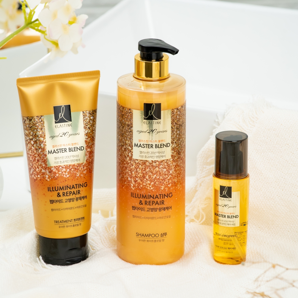看到韓妞每個人的頭髮都順到根本不需要梳子的存在,忍不住想難道她們天天都到髮廊報到嗎?!最後發現原來他們都是直接把「大師」帶回家中,Elastine Master大師系列主打彈力修護,因為裡面有添加3X鑽石光采修護,胺基酸、胜肽、鑽石配方跟4X植物油精萃,摩洛哥堅果油、夏威夷果油、荷荷芭油、辣木油配方,結合六種獨家專利技術修護受傷的秀髮毛鱗片,並給它滿滿的養分,幫助髮絲保濕鎖水、恢復彈性,這個冬天就快快使用金瓶修護髮絲,增加彈力光澤,也難怪Elastine Master大師系列可說是韓妞們的國民洗髮精呢!