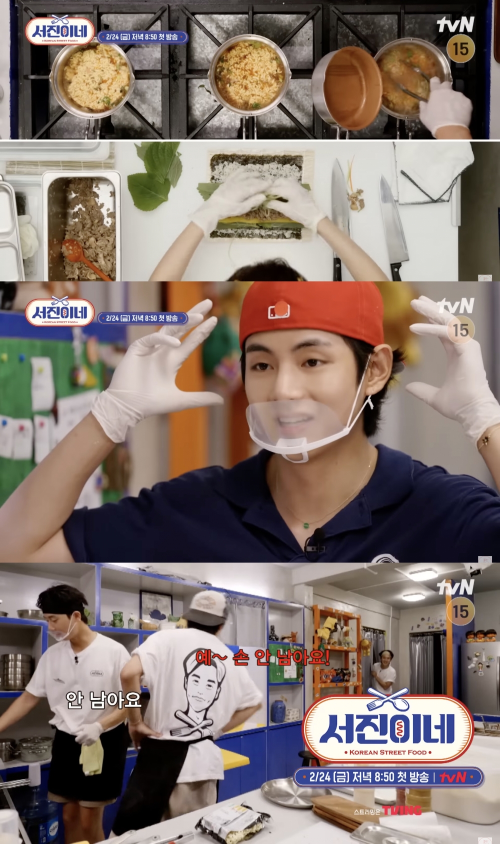 金泰亨忙到暈頭轉向、說不出話來,不過一道道美味佳餚也持續上桌。最後,崔宇植跑到後廚找人手幫忙:「有空的人?」結果被朴敘俊和金泰亨果斷拒絕:「都沒空喔!」(笑),在演藝圈中是著名至親的3人,在百忙之中也開玩笑地吵吵鬧鬧,讓大家對他們的團隊合作也充滿了好奇。