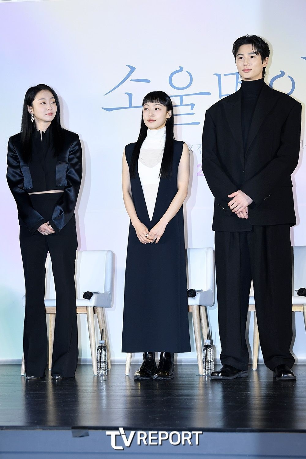 今日,金多美、全少妮、邊佑錫一同出席《靈魂伴侶》的製作發佈會,三位主演十分有默契地穿了同色系的「情侶裝」亮相,彷彿也在呼應三人在片中糾纏的三角戀。