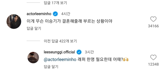 李昇基官宣婚訊後,好友李敏鎬也在貼文留言:「這是李昇基要唱《結婚好嗎》的情況嗎?」(《結婚好嗎》是李昇基的歌) 而李昇基也回覆:「我還需要一名 Rapper ,你考慮下?」或許李敏鎬真的有可能受邀去婚禮唱祝歌啊(誤)~