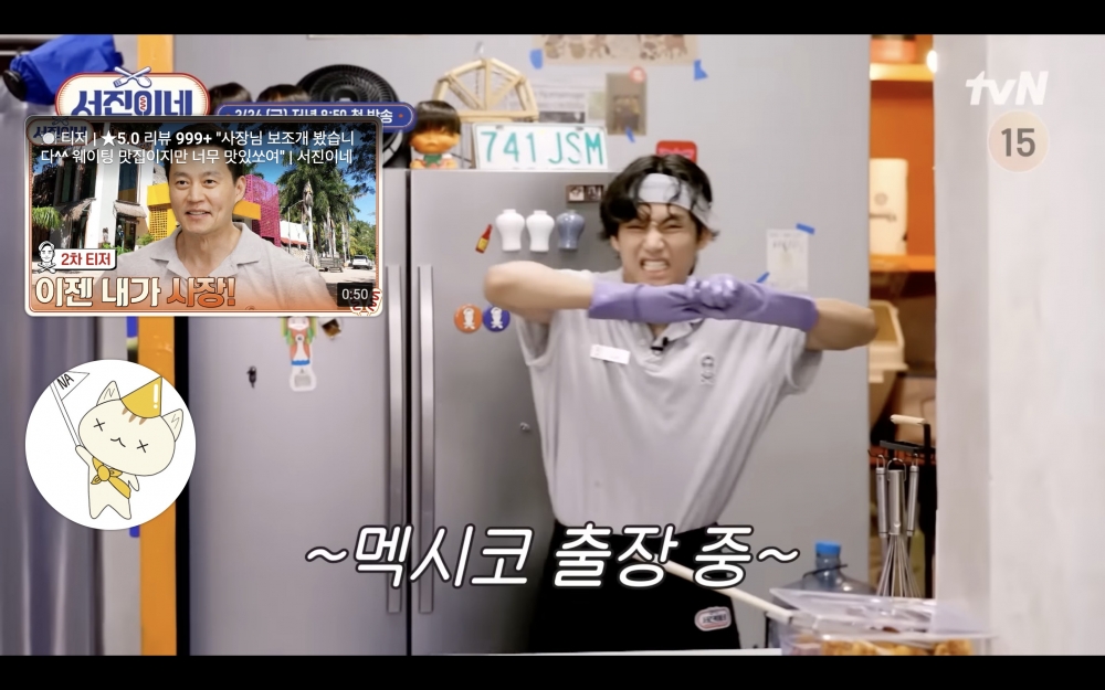 兇巴巴嫌鏡頭擋路的理事鄭有美是「紫菜飯捲王」,負責紫菜飯捲的製作。部長朴敘俊則是「料理王」,金泰亨問他:「哥你的夢想是成為漫威演員嗎?」沒想到朴敘俊卻回答:「不是,是當這家店的社長。」歐巴這是想篡位啊XD