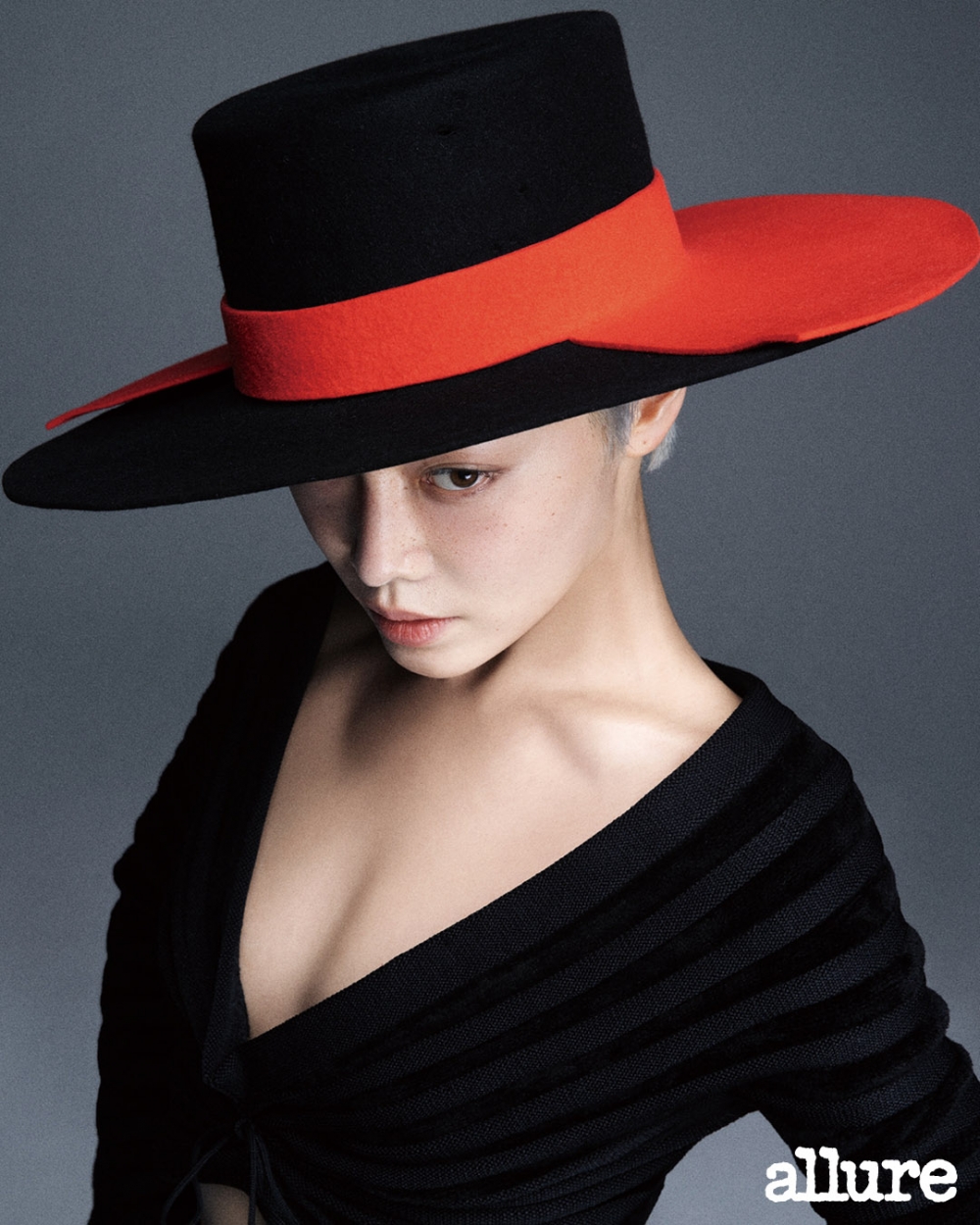 韓國雜誌《allure》近日公開金赫拉以「I am Here」為主題拍攝的一系列時尚畫報,照片中她以破格的短髮造型登場,加上無表情的面貌散發出充滿中性魅力的的魅惑美。