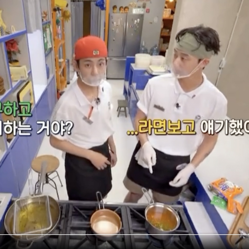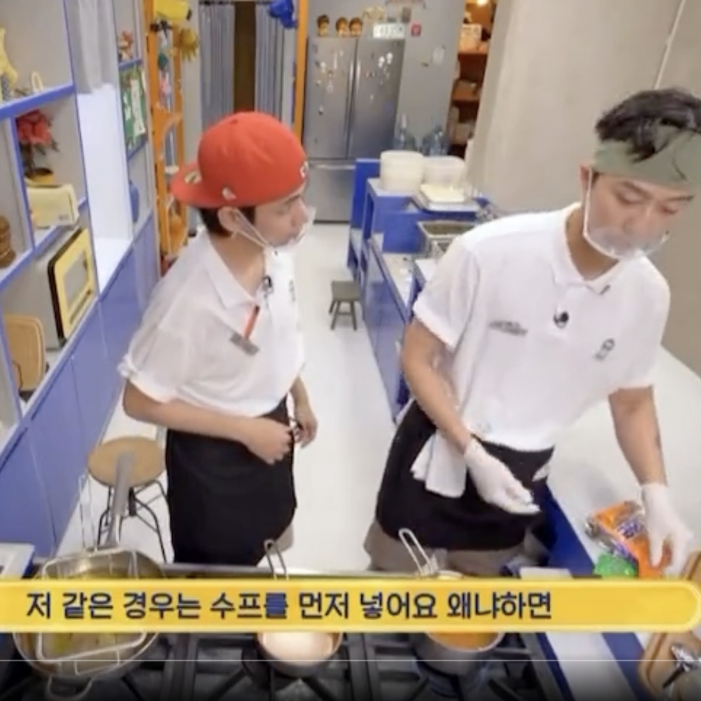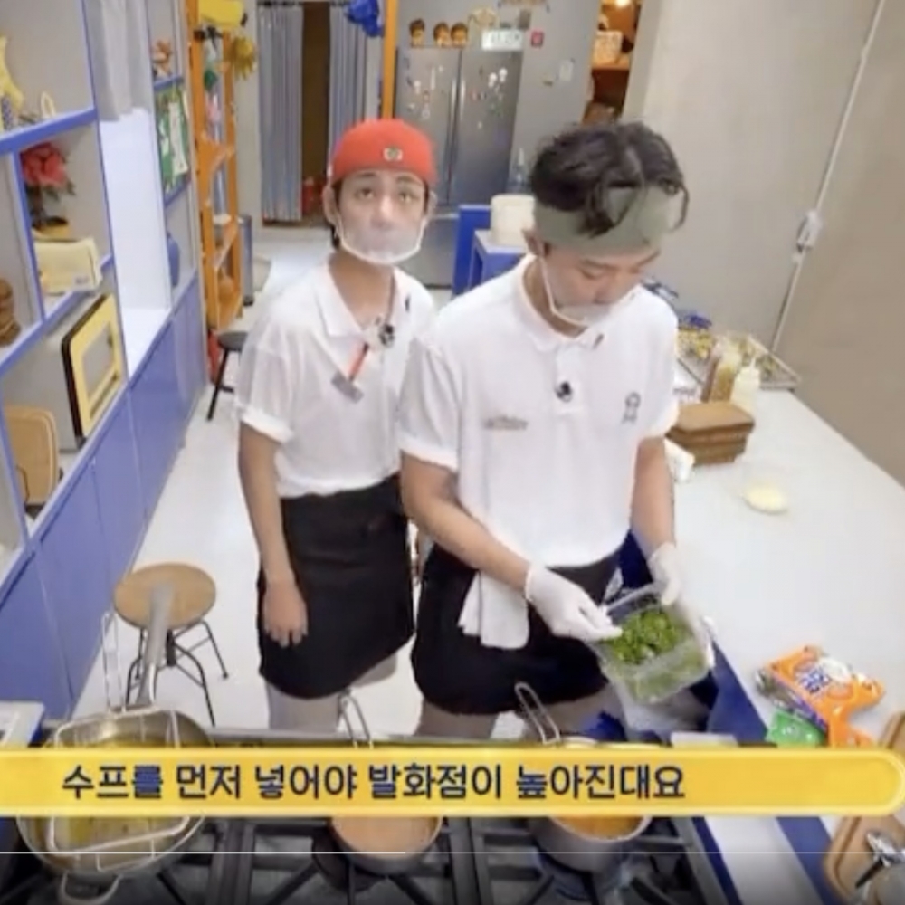 節目中,朴敘俊與V的一段對話在韓網引起討論,網友表示原來這就是「專業演員與專業偶像的差別」嗎(笑)。廚房長朴敘俊迎來第一個訂單,就是起司泡麵!朴敘俊一邊料理一邊說:「我的話,一般會先放調味包,說是先放調味包燃點會變高,水很快就會滾。」