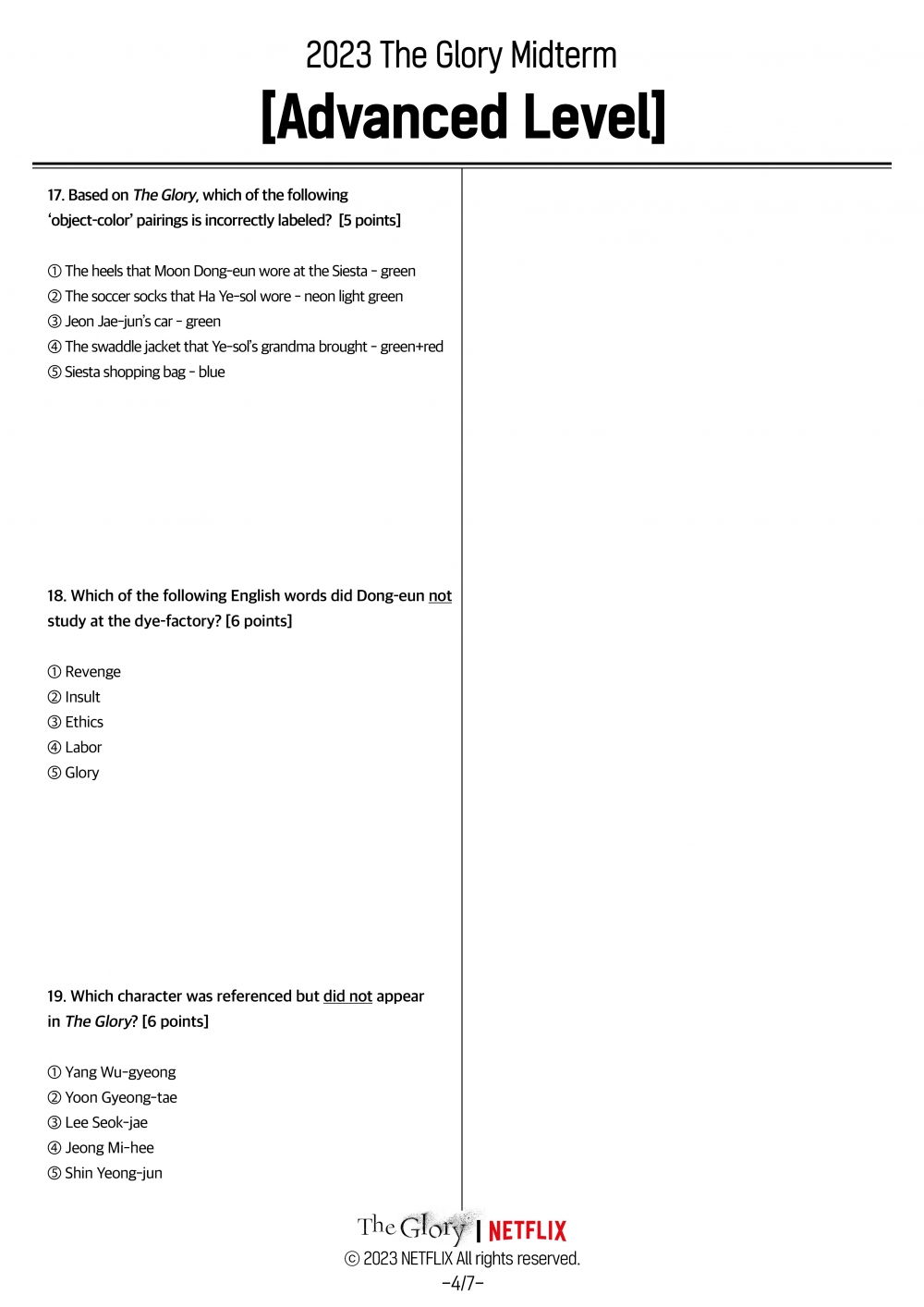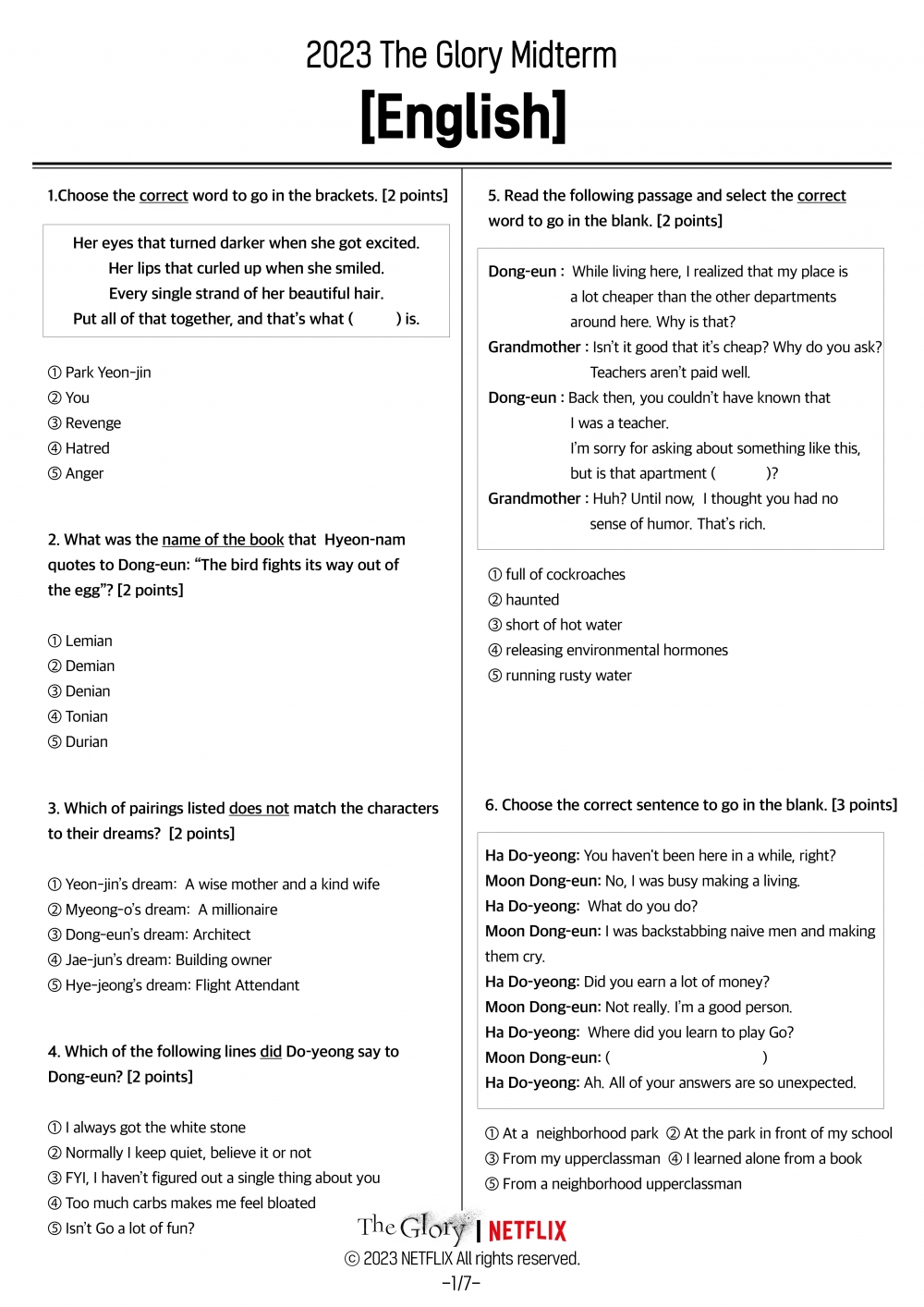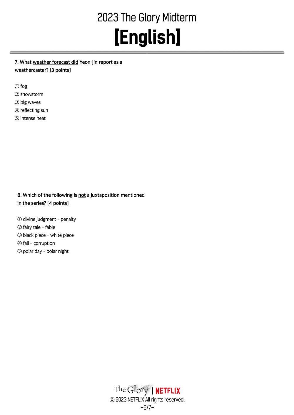 雖然目前只有釋出英文和韓文版的試題,但有興趣的劇迷們也可以來挑戰看看自己能拿幾分吧!《黑暗榮耀》期中考試題韓文版/英文版↓↓↓
