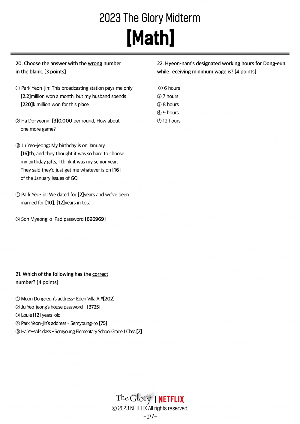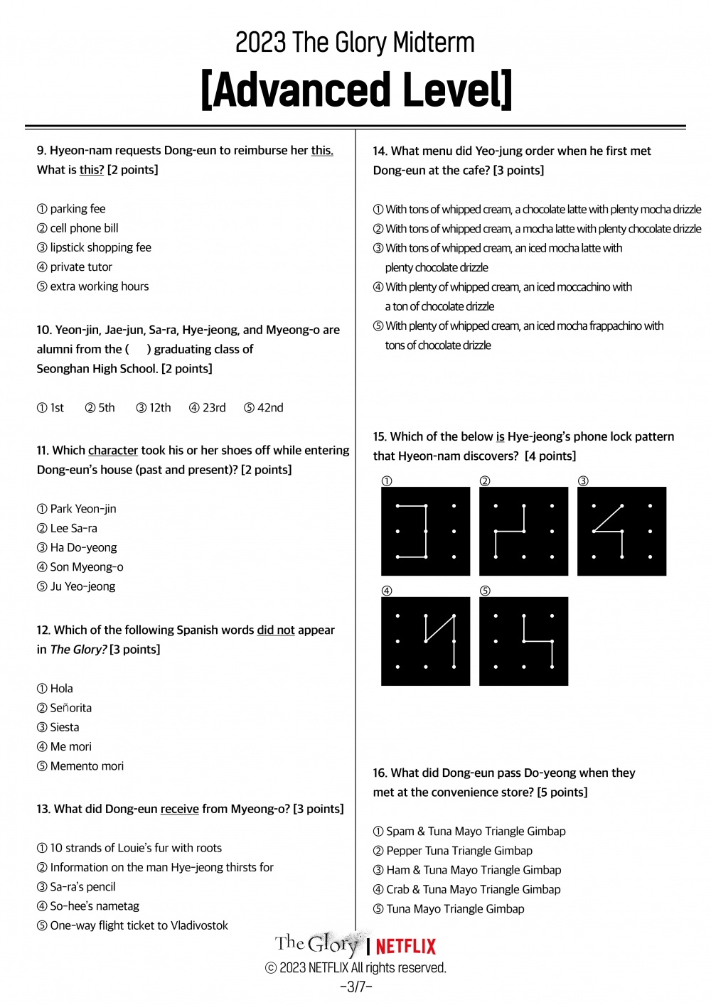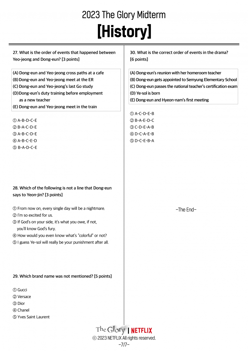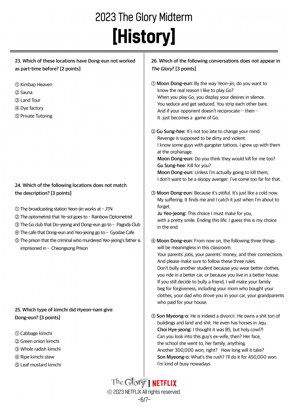 雖然目前只有釋出英文和韓文版的試題,但有興趣的劇迷們也可以來挑戰看看自己能拿幾分吧!《黑暗榮耀》期中考試題韓文版/英文版↓↓↓
