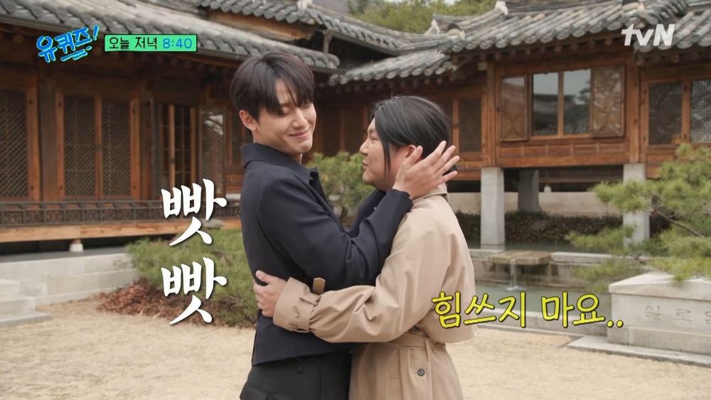 李到晛一雙小手無處安放,臉也尷尬地轉向旁邊,全身超僵硬的模樣連曹同珢都忍不住說:「你別用力!」然而以上,其實還只是在對戲而已。曹世鎬退開後問導演拍得怎麼樣,而李到晛則深深地「哈...」長嘆一口氣XD