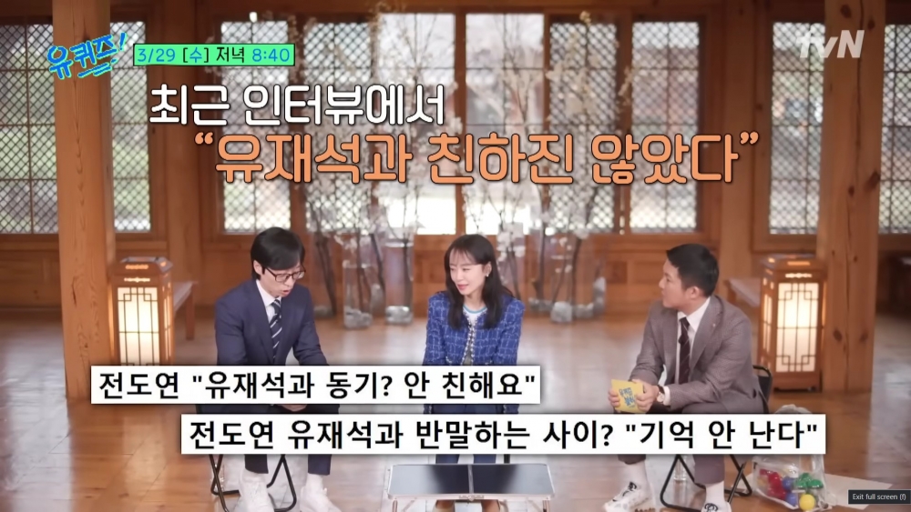 全度妍與「國民MC」劉在錫是首爾藝術大學放送演藝系91級的同期同學,大學期間她也曾到場為參加學校「搞笑節」的劉在錫加油應援。時隔多年在2021年的百想藝術大賞再次相遇的兩人,原以為從學生時期就培養出好交情的兩人,全姐因對著同期的劉在錫說敬語,讓劉在錫在發表獲獎感言時公開點名她XD