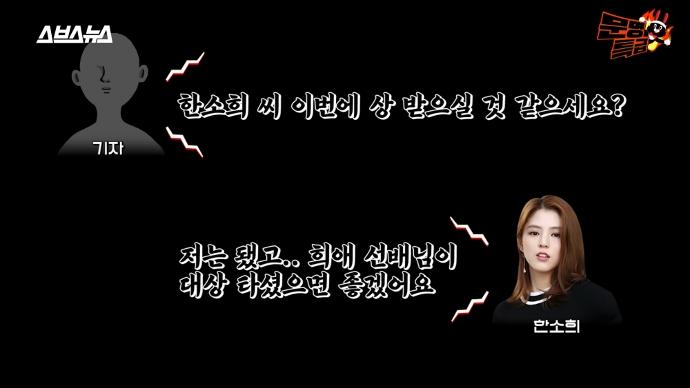 另外,節目組還幫金喜愛回顧當時在第56屆百想獲得「女子最優秀演技獎」的現場,金喜愛也表示在拍攝《夫妻的世界》和演員們的配合非常好,她説當時因和韓韶禧是對立角色的關所以故意保持距離,怕影響入戲。金喜愛還誇贊韓韶禧說她很漂亮、是個非常努力、已做好準備的明星。對此,JaeJae分享當時去後臺采訪韓韶禧問她對於這次的大賞有沒有信心獲獎時的小插曲。韓韶禧表示:「我就算了,我希望喜愛前輩可以獲獎」金喜愛聽後忍不住大笑還説:「心真善良呢~」拜托再讓兩位演員合作吧QQ