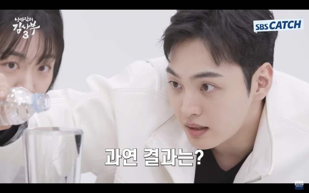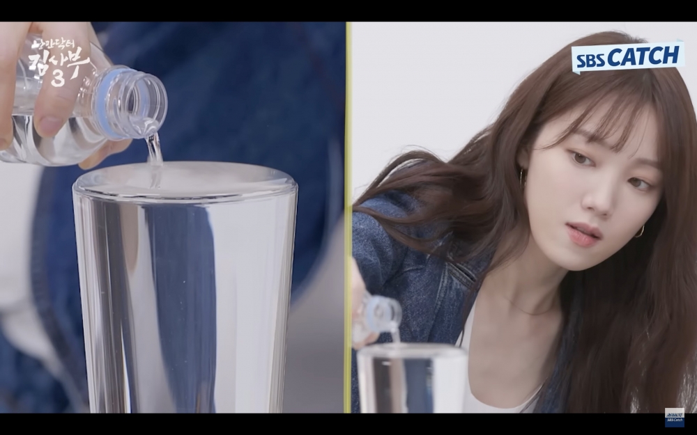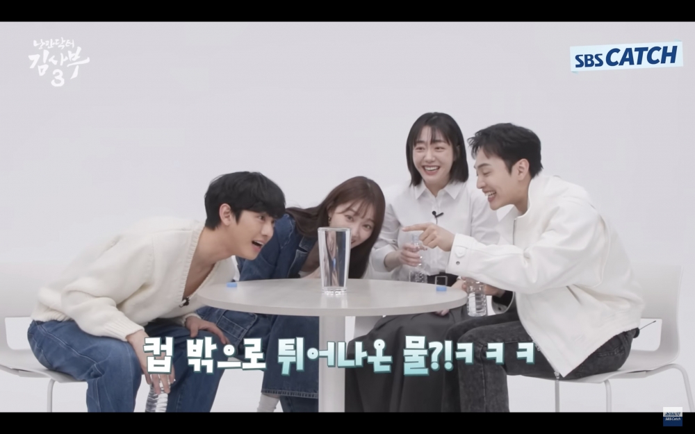 首先是「倒水遊戲」,大家輪流往空杯裡面倒水,誰先倒水至溢出誰就是輸家。蘇珠妍一開始就把半杯玻璃杯填滿,輪到李聖經時水已經來到8分滿,經過2-3輪後水杯終於被填滿,但神奇的事發生,演員們紛紛驚訝水怎麼倒都不會溢出,還想說是不是隱藏攝影機要整他們,就再經過5-6輪的倒水後最終輸家出爐...那就是「恩卓護士」金旻載。