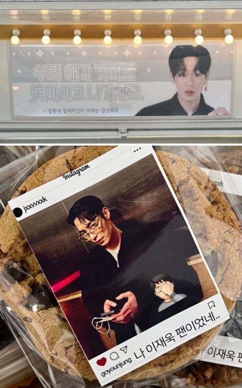 而高允貞之前拍攝《Moving》時收到李宰旭送來的應援咖啡車,橫幅是「隔壁富家少爺送來的感性茶點」貼紙則寫著「我是高允貞的粉絲」,兩人的看板還都是站在草地上拿著落壽配劍的選圖,拼在一起也不違和。