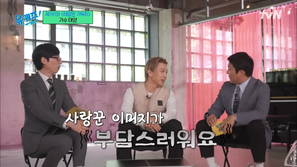 當提及妻子閔孝琳時,太陽的臉上更是露出了幸福的笑容。近期正忙於發行個人單曲的他表示這次的回歸妻子給予了許多意見,而他也采納了其中的點子加入MV當中。被曹世鎬說是「寵妻狂魔」時,太陽立馬回應說:「不過,我身為寵妻狂魔的這個形象,有時候覺得還挺壓力的。因為這樣,我太太就會私下和我說『身為寵妻狂魔,你不應該對我好一點嗎?』」引發現場一片笑聲XD