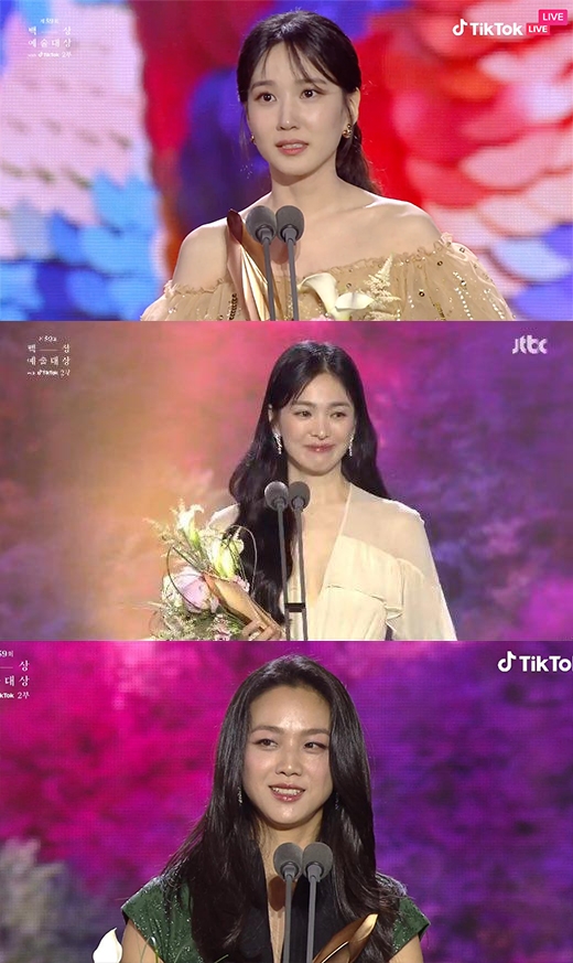 接著他還抨擊了這次拿到大賞的朴恩斌,認為她致詞時哭哭啼啼不夠專業,走上台的過程不停鞠躬、聽到音樂被嚇到後又開始哭...「也不是18歲而是30歲的成年人了,應該向宋慧喬好好學習。」金甲洙認為在發表獲獎感言時最好要說自己的想法,不該哭哭啼啼的,而獲獎者們不停鞠躬看似很有禮貌,但以前的風氣不是這樣的,並以這次分別拿下影后、視后的湯唯跟宋慧喬舉例,稱讚兩人的風範就是教科書級別的。