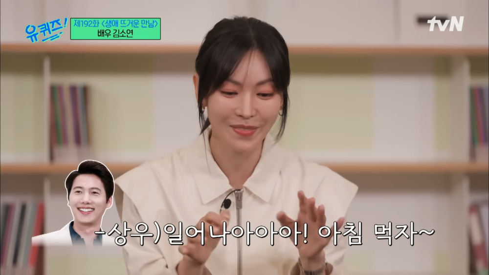被問到近期與丈夫李尚禹的過的如何時,金素妍臉上露出了幸福的笑容且分享說:「歐巴(李尚禹)會每天早上會抱我到餐桌上一起吃早飯,雖然很想睡覺,但是可以和歐巴一起吃飯,我很開心,他也很開心。」歐尼還補充說之前有一段時間都在拼命工作、完成沒有生活的她在遇到李尚禹後,說了這麽一段話讓她從此改變了:「素妍啊,雖然演員金素妍很重要,但也要珍惜作為普通人的金素妍啊。」歐尼和歐巴要一直幸福下去啊~