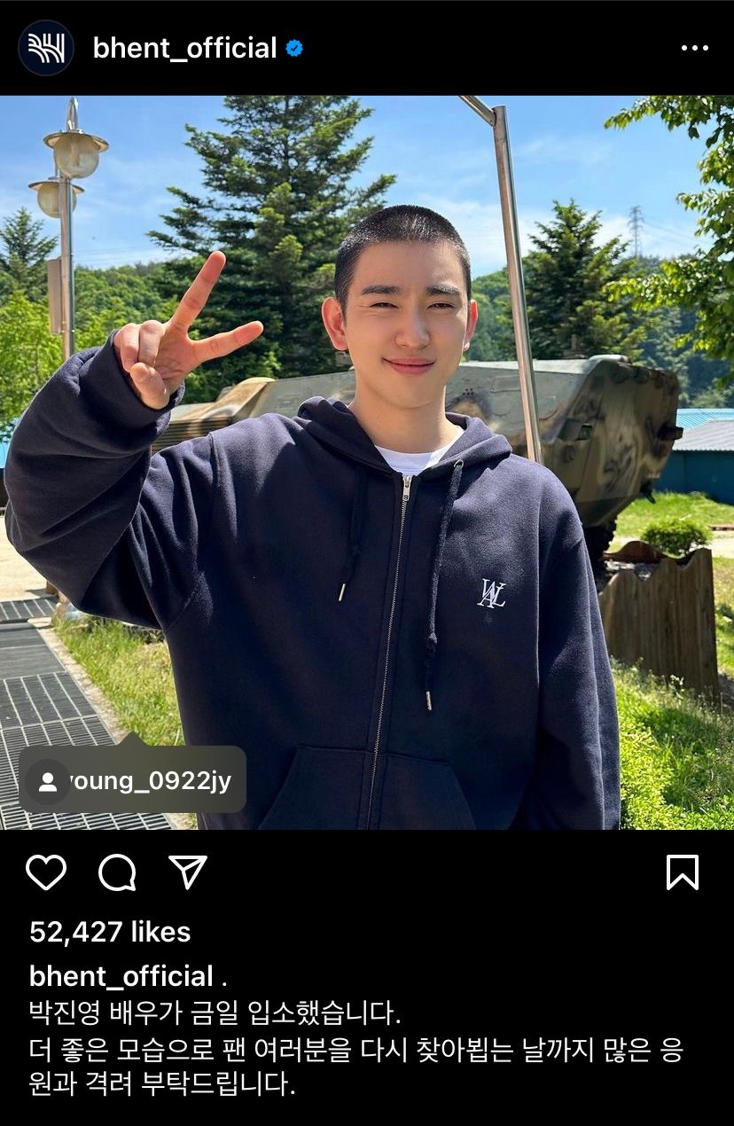 昨日,朴珍榮也在自己的IG賬號上傳了一張已剃頭的自拍照,而GOT7的兩位弟弟BAMBAM、有謙也在該帖子下留言表示:「好去好回哥,等你回來(擊掌)」、「愛心」。而經紀公司的官方IG也上傳了朴珍榮頂著大太陽比耶德照片並配文說:「演員朴珍榮今天入伍了,希望大家多多支持和鼓勵,直到以更好的面貌再次與粉絲們見面的那一天。」