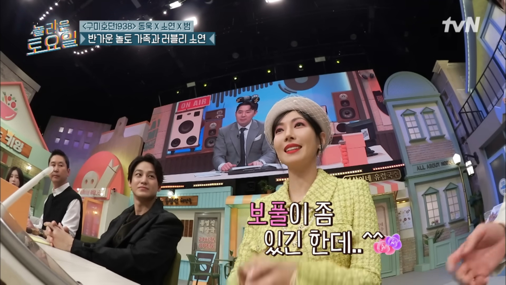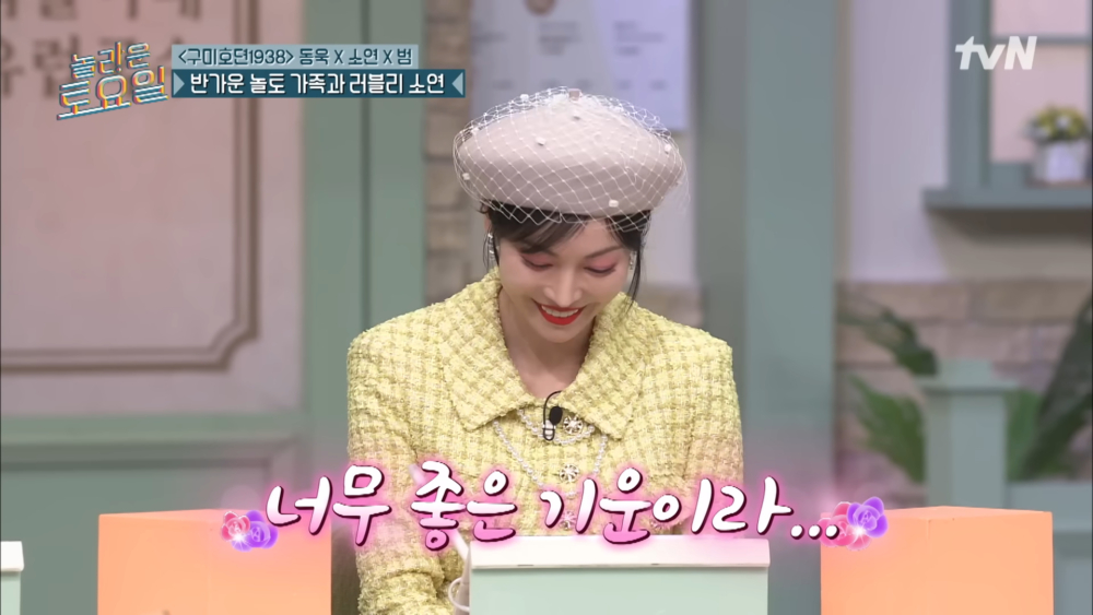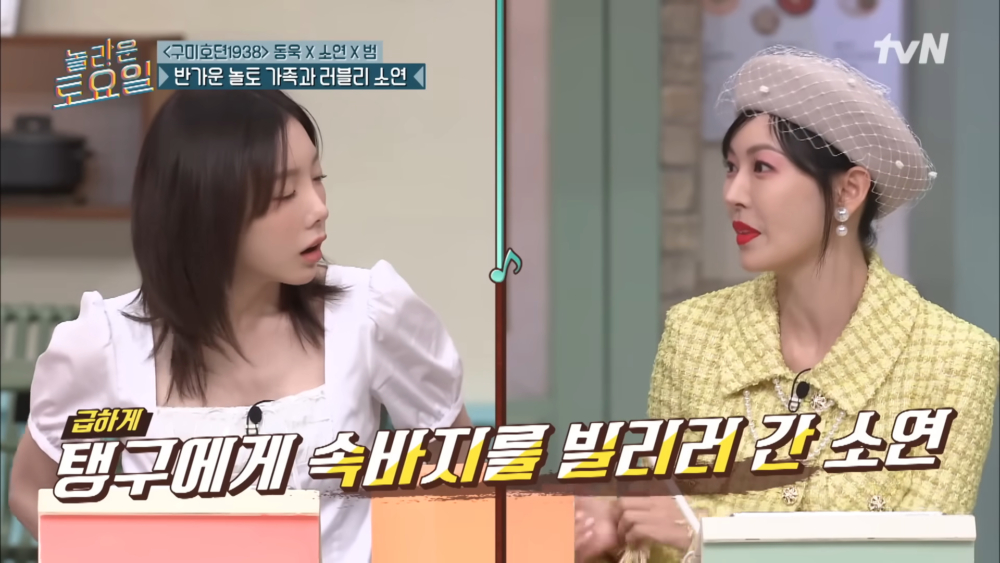 節目中,金素妍有些害羞的表示自己有話想對太妍說,而當事人太妍在聽到此話後驚訝地捂著嘴巴,臉上露出疑惑又認真的表情努力在回想起與歐尼的往事XD歐尼接著分享說在13年前KBS的脫口秀節目《承勝長驅》中,兩人有一起錄過節目,而錄製當天有一段類似要跳舞的部分,當時穿著超短裙的她得知要跳舞後非常的慌張,於是便向太妍借了一件安全褲應急~