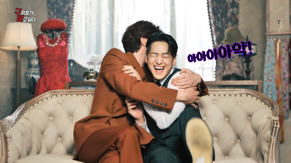 因為要拍出狐妖兄弟互看不順眼的不合關係,拍攝前金汎還對李棟旭說要「就假裝討厭一下吧哥~」,因為私底下兩人根本超有愛(笑)~ 李棟旭搭著金汎的肩膀,金汎則演出嫌棄的表情,結果下一秒李棟旭直接抱緊處理,讓金汎大叫「啊~」,但表情看著怎麼這麼開心呢XD
