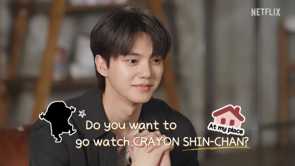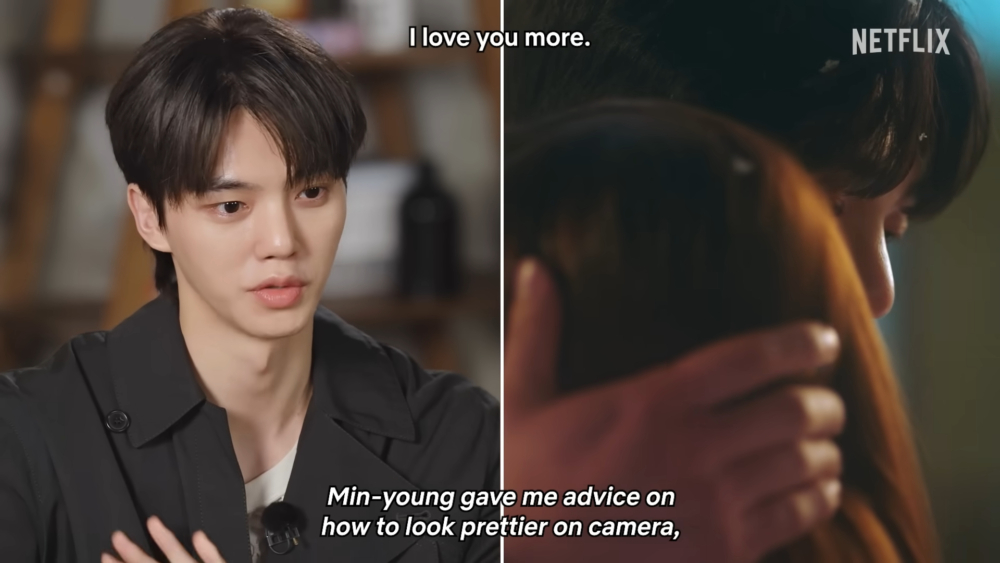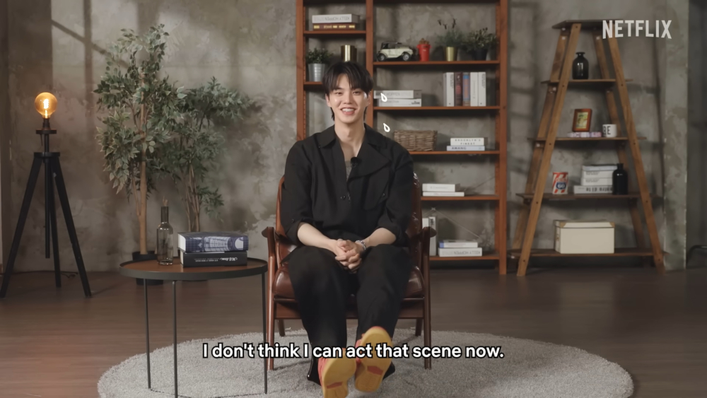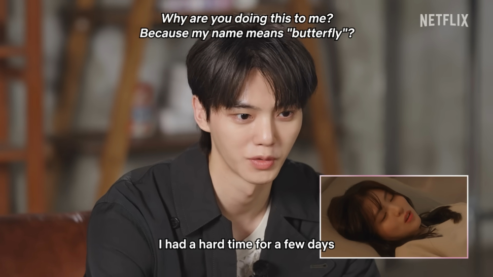 然後就是重頭戲床戲... 看著自己與韓韶禧纏綿相吻的畫面,宋江一連發出好幾聲「噢、噢、噢」XD 被問到如果他是男主角朴宰彥會傳什麼訊息給喜歡的人,宋江回答:「要去看蝴蝶嗎?」但如果是自己的話,他本人會傳:「要去我家看蠟筆小新嗎?」(笑倒)