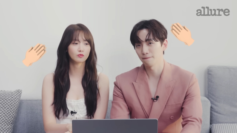 被問到拍攝待機如何打發時間時,我們俊昊潤娥突然面向對方,決定現場示範給大家看。然後兩人就在那兒擊了好幾次掌,是説拍的那麽用力,你們的手不痛嗎XD隨後,潤娥也解釋到這對他們來説是打鷄血的一種方式,而且一定要發出兩個巴掌拍響的聲音才算成功(笑)