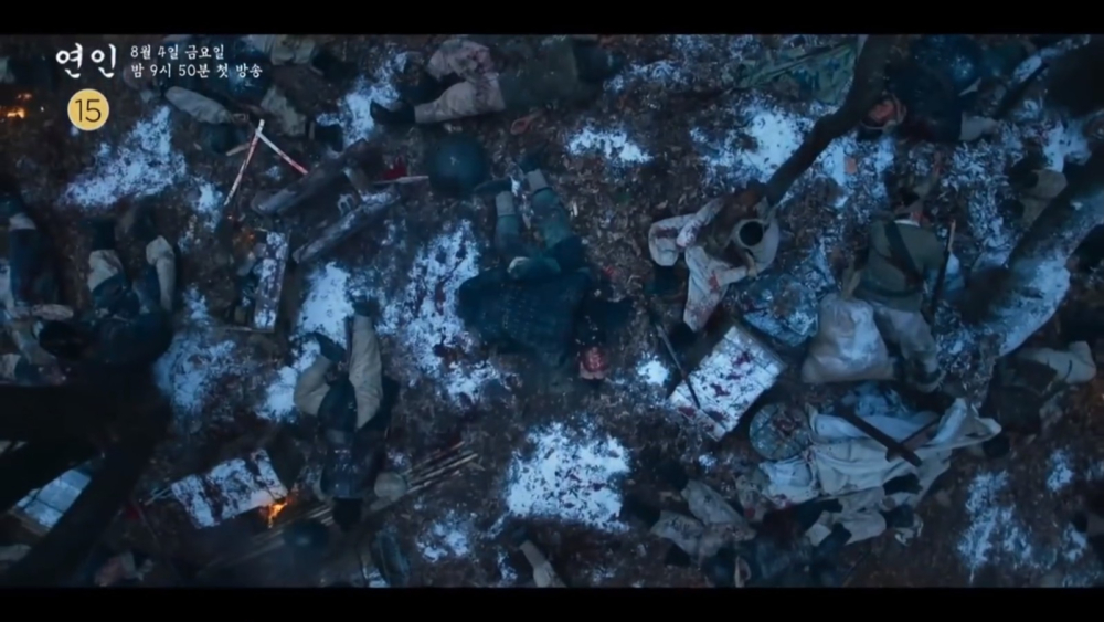 畫面立刻充滿了戰爭後留下的殘局,冒着雪,拖著弱小的身軀去避難的柳吉彩與景恩愛;穿上盔甲與敵軍展開慘烈戰鬥的南延俊在無法預測未來的危急戰爭狀況下,繞遠路再次相遇的李長賢和柳吉彩。 僅憑兩人的眼神就讓人心痛不已,在這樣的情況下,他說:「我對着月光發誓。 這次不管你在哪裡,我一定要去見你。」