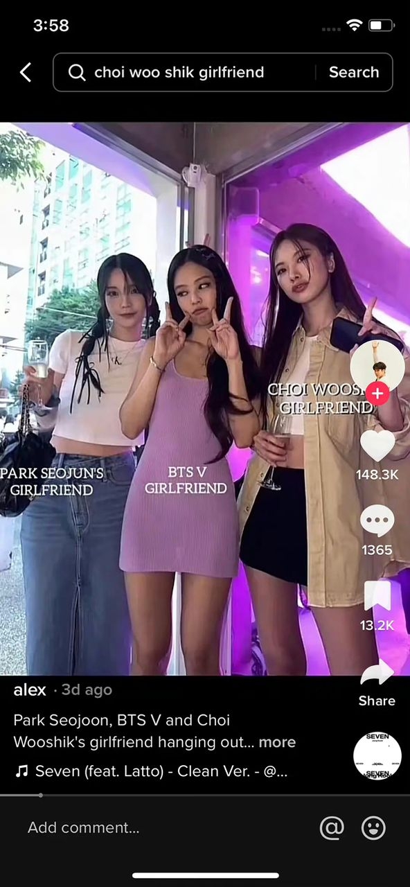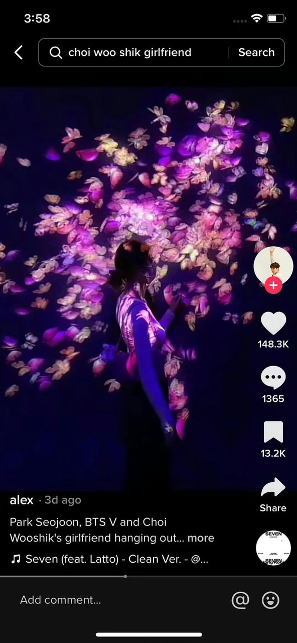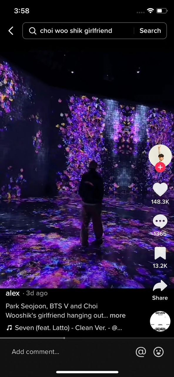 Tiktok上影片的内容則是放了崔宇植與Jujujuheejung打卡同一個展覽的背影照,其中還包括了V和朴敘俊的「女友」Jennie、Xooos(수스)的合照,並配文到「朴敘俊、BTS V和崔宇植的女友一起出去玩。」