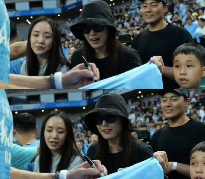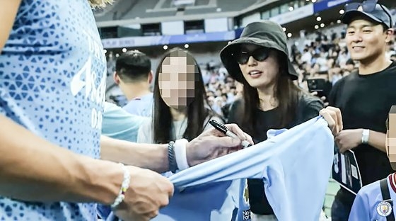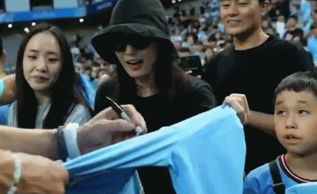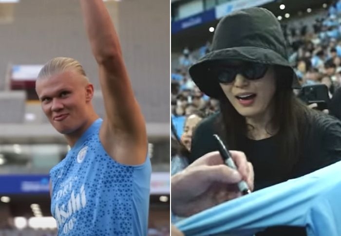 影片中,當天比賽結束後,曼城選手們在球場上給球迷們簽名,其中一名戴著黑色墨鏡和帽子的女球迷在得到哈蘭德的簽名後反應十分興奮,沒想到之後卻被網友認出她竟然是女神全智賢!