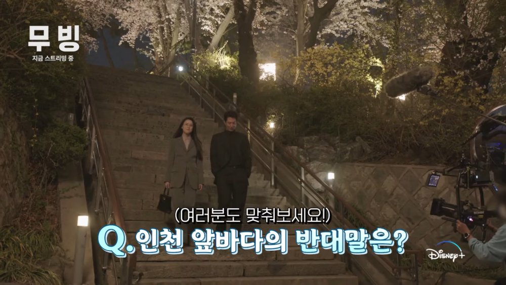 之後拍攝在櫻花樹下散步的場景,斗植拿冷笑話測驗問美賢:「仁川前海的反義詞是?答案是仁川媽媽(韓文諧音梗)。」把我們美賢都逗笑了。而趙寅成和韓孝周拍完來看這段回放時也笑到不行。