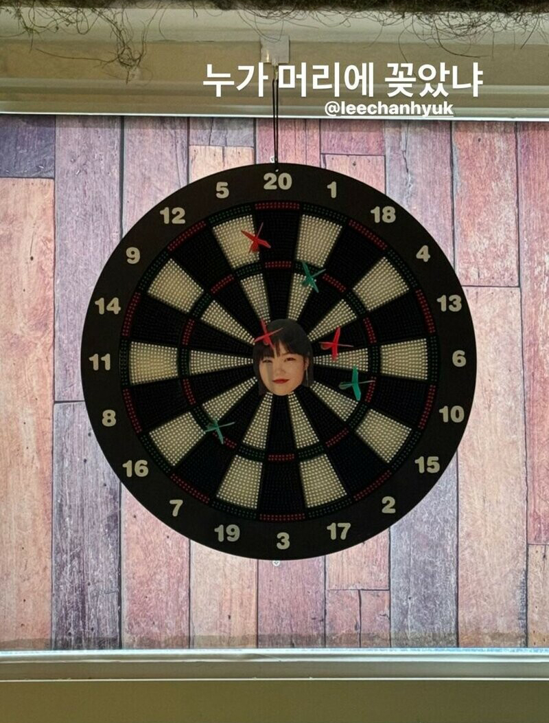 李秀賢發現自己的頭像成為靶心甚至上面還有插了飛鏢,馬上tag李燦赫質問:「是誰插到我頭上的?」