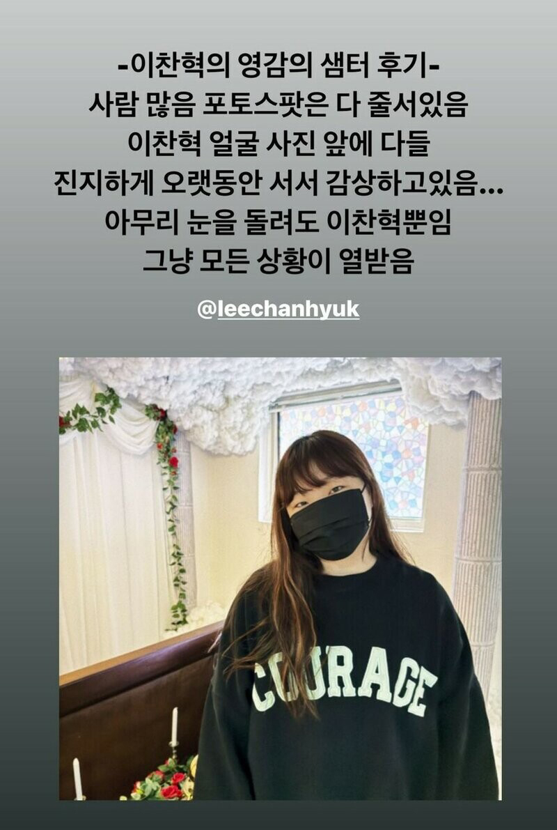 最後李秀賢也分享了「李燦赫靈感之泉後記」,她表示:「人很多,照片區都在排隊,大家都站在李燦赫臉的照片前認真觀賞很久... 不管怎麼看都只是李燦赫啊,所有情況都讓我火大。」