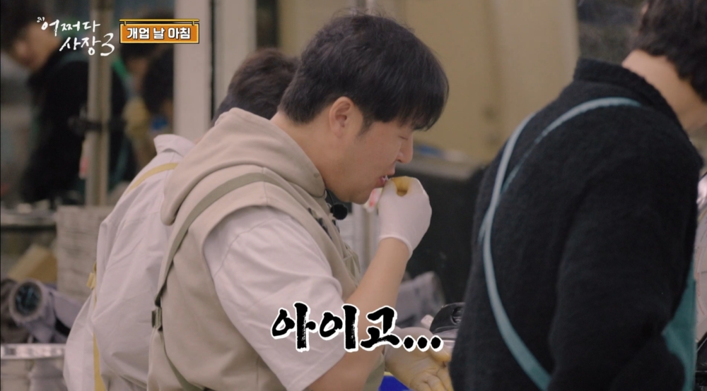 早上忙碌一段時間後,趙寅成、韓孝周、尹敬浩在吧檯稍作休息吃東西補充體力。就在此時,韓孝周眨著大眼睛對著趙寅成張開嘴巴說:「啊~」而趙寅成也立馬將手中的蛋捲喂進「老婆」嘴裡~是説你們有考慮過尹敬浩的感受嗎...他連頭都不敢擡啊XDD