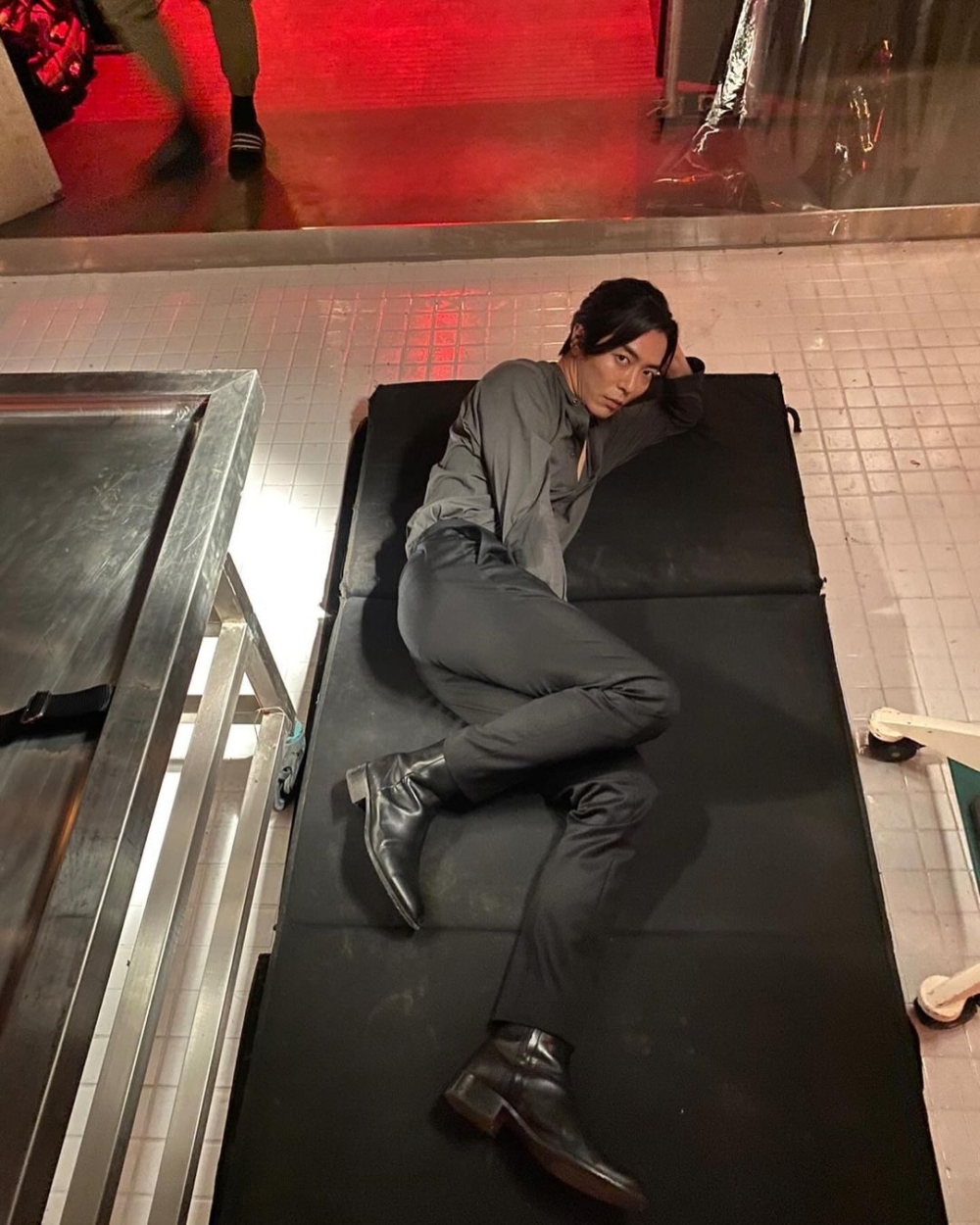 金智勳與金材昱後來在網上分享了這場戲的幕後照,兩人身上都血跡斑斑,卻依舊擋不住他們的顏值(?)。金智勳斜靠在手術台旁帥得像雕像,金材昱則把玩著斷肢道具,還性感地躺在手術台上~