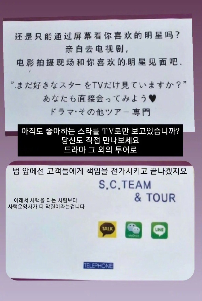 最後,金在中還發布了私生計程車司機的名片,上面用中、日文寫道:「還是只能透過螢幕看你喜歡的明星嗎?親自去電視劇、電影拍攝現場和你喜歡的明星見面吧。」對此,金在中表示:「在法律面前,他們肯定會把責任轉嫁給乘客的。因此,運營私生計程車的公司比乘坐私生計程車的人更加惡劣。」