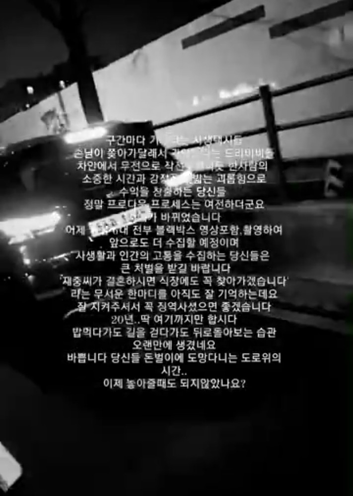 他還說:「現在時代變了。包括行車記錄器的影片在內,我拍攝了昨天全部6台車的影片。今後還會繼續收集證據。希望收集私生活和他人痛苦的你們能受到嚴重的處罰。」