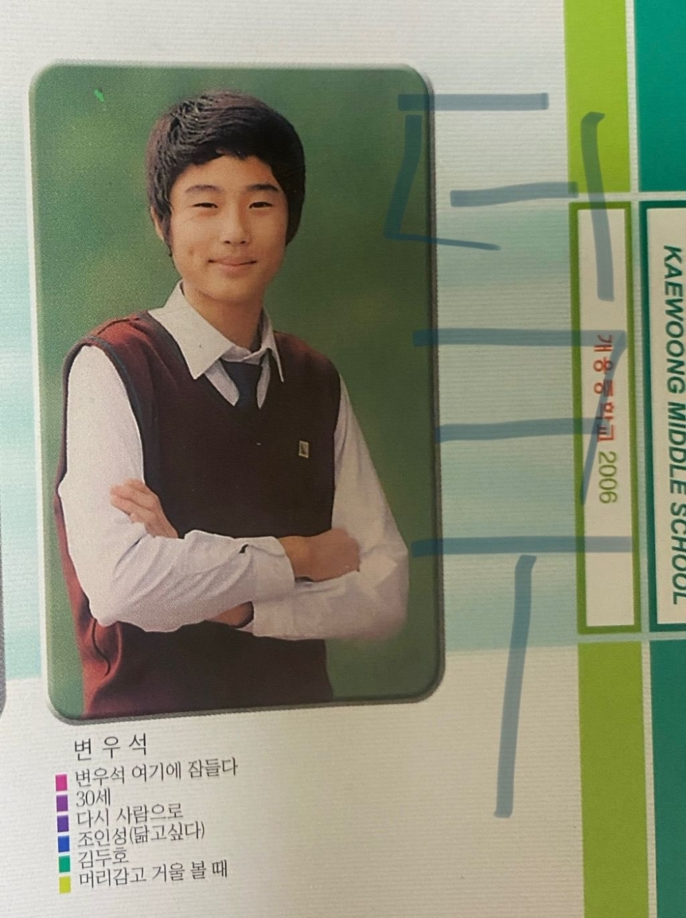 邊佑錫在劇中有大量學生時期的戲份,官方之前曾公開了「柳善宰」的高中畢業照,今年33歲的邊佑錫穿上校服絲卻毫無違和感,看起來十分清新帥氣。不過有網友挖出邊佑錫本人過去的畢業照,青澀屁孩模樣真的太真實啦~這才是小編熟悉的畢業照(笑)!