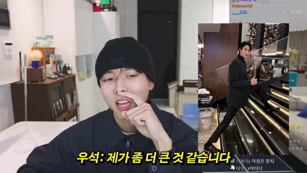 朱宇宰直接說:「真的很抱歉,其實我之前在綜藝節目上當場量過身高的...」(邊佑錫發出心虛的乾笑XD) 朱宇宰表示自己測出來是188cm多,他問邊佑錫:「你就告訴我,你有比我高嗎?(別想解釋) 你就說比我高還是比我矮吧。」明顯比朱宇宰高的邊佑錫只能承認:「哥我就老實說了,我好像是更高一點,我承認。」