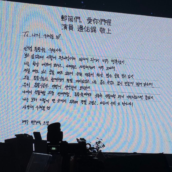 邊佑錫不但為粉絲獻唱〈I Think I Did〉,最後更帶來了最經典的〈陣雨〉,為見面會劃下圓滿的句號。他還為寫了親筆信給粉絲:「你好,筒筒們,我是佑錫。真的很想你們,能夠在Fan Meeting這樣見到你們真的很幸福。謝謝大家一直珍惜我、看好我、喜愛我。辛苦、疲憊的時候,多虧大家的應援我得到了很多力量,今天和筒筒們在一起真的很幸福,我覺得我們一起創造了美好的回憶,不知道筒筒們是怎麼想的?宰,筒筒們對我來說也是珍貴的禮物,希望大家都能記得今天,感謝大家為了看我遠道而來,下次我們再見。」