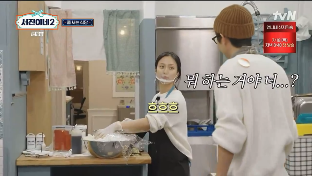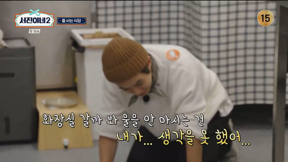 崔宇植走進廚房看到她忙碌的樣子,先是一臉疑惑,然後笑著說:「你怎麽都不休息啊?你喝水了嗎?」高旻示回復說:「沒呢。因為擔心想去衛生間,所以沒喝。」崔宇植聽後說:「沒想到會是那種程度...」然後癱坐在地XD