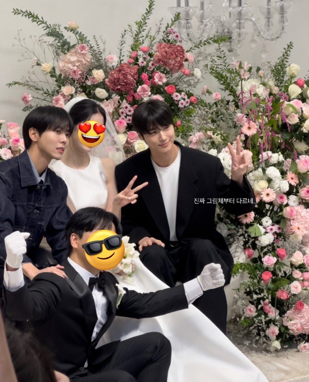 在上傳的照片中,只見朱宇宰與邊佑錫一左一右坐在新娘兩側,新郎則在前面擺出姿勢。照片公開之後網友們都超羨慕能被兩位長腿帥哥包圍的新娘啊XD 同時粉絲們也很感謝能從朱宇宰這邊得知邊佑錫的近況。