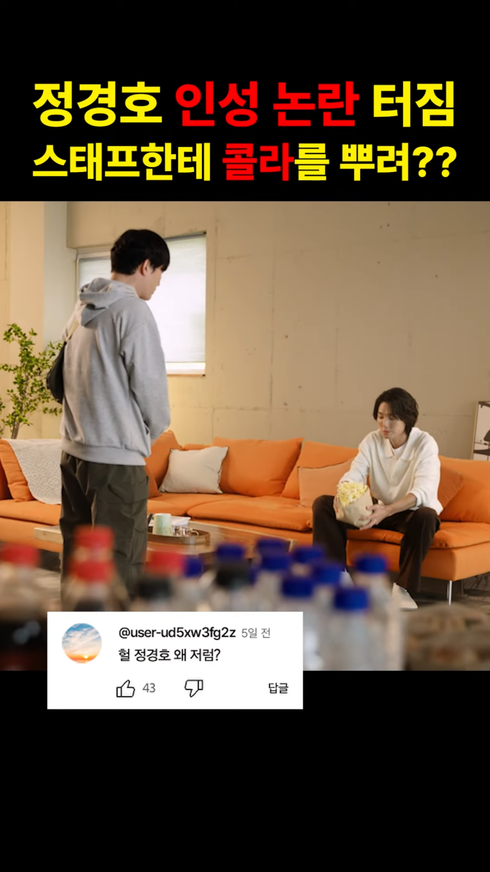 與此同時,畫面上出現了「天啊,鄭敬淏怎麼了?」、「當著人面撒零食,真讓人生氣」、「那些傳言是真的嗎?」「我也聽過一些事,不想多說」、「潑可樂真的過分了吧」、「有必要潑可樂嗎?」、「一直覺得鄭敬淏不會這樣,真失望」等評論。