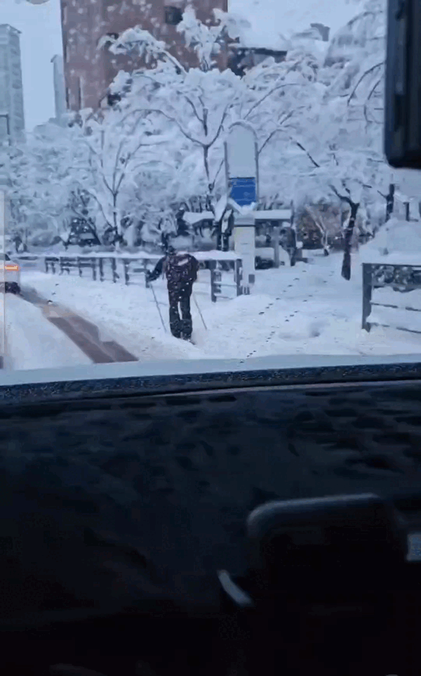 28日,韓網各大論壇和SNS上接連上傳了「上班路滑雪者登場」、「K上班族的意志」的相關照片與影片,從中可以看到路邊一名男子背著背包、戴著帽子與手套,努力划動著滑雪杖向前進,「滑雪上班」的奇景被不少網友拍下來上傳到的網上。