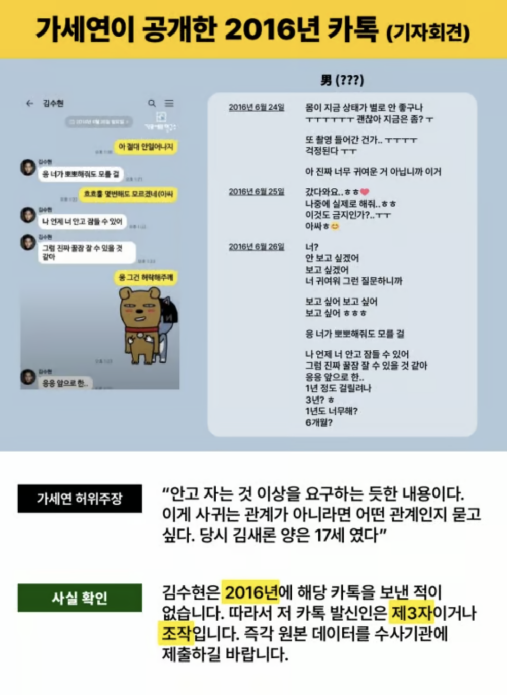 金秀賢方事實確認:金秀賢在2016年沒有發過這個消息,發送這個消息的人是第三者或是造假的,希望立即向調查機關提交原始數據。