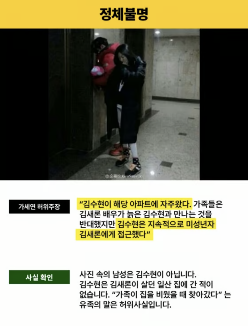 金秀賢方事實確認:照片中的男性不是金秀賢,他沒有去過金賽綸的這個家,遺屬們主張的「在女方家人不在家的時候去過」是虛假事實。