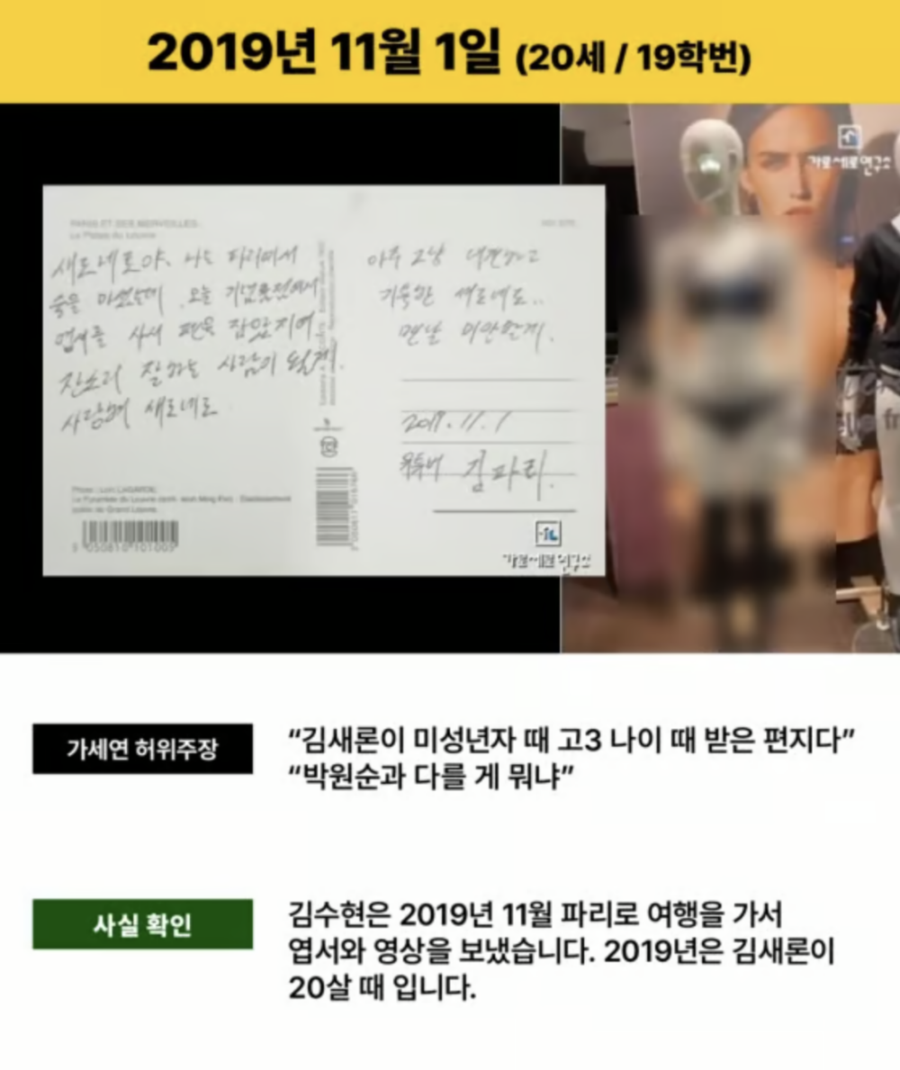 金秀賢方事實確認:這是金秀賢在2019年11月去巴黎旅遊的明信片和發送的影片,2019年金賽綸已經20歲(韓國年齡)。